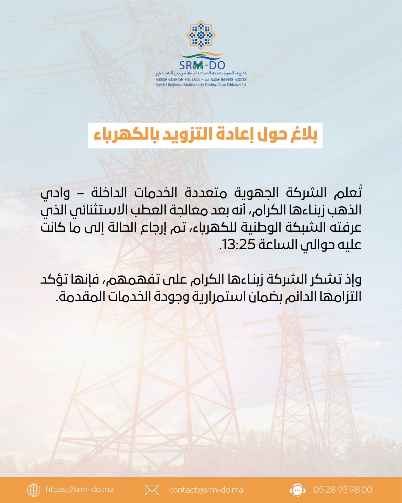 أفادت الشركة الجهوية متعددة الخدمات بجهة الداخلة – وادي الذهب أنه تم إعادة التزويد بالطاقة الكهربائية إلى وضعه الطبيعي، بعد معالجة العطب الاستثنائي الذي عرفته الشبكة الوطنية للكهرباء، وذلك حوالي الساعة 13:25 زوالاً.