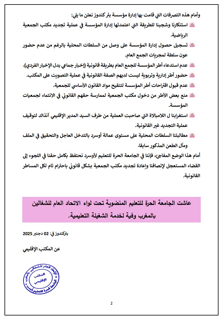 وأشار البيان إلى أن هذه التجاوزات تأتي في وقت كان من المفترض فيه أن يتم تجديد مكاتب الجمعيات الرياضية المدرسية وفق المذكرة رقم 25-00507 الصادرة عن الجامعة الملكية المغربية للرياضة المدرسية بتاريخ 14 أكتوبر 2025، والتي أكدت على ضرورة انعقاد الجمعيات العامة قبل نهاية أكتوبر 2025، باستخدام النظام الأساسي النموذجي رقم 426/25 الصادر بتاريخ 25 يوليوز 2025.
