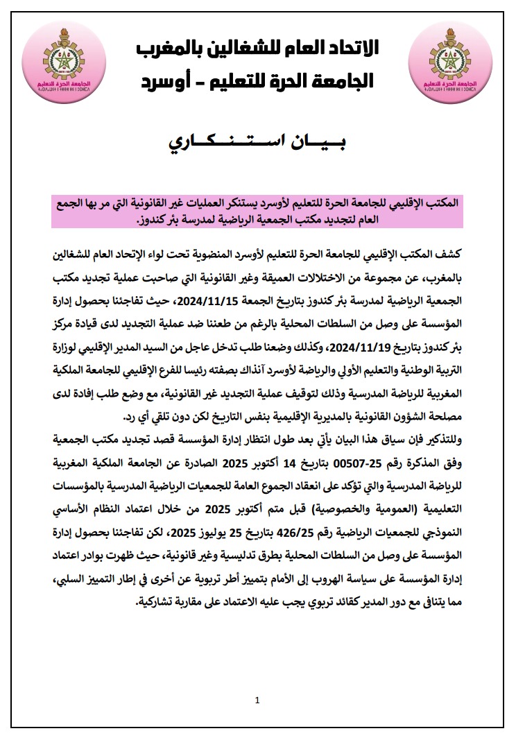 أصدر المكتب الإقليمي للجامعة الحرة للتعليم بأوسرد، المنضوية تحت لواء الاتحاد العام للشغالين بالمغرب، بيانًا استنكر فيه مجموعة من الخروقات القانونية التي رافقت عملية تجديد مكتب الجمعية الرياضية لمدرسة بئر كندوز يوم الجمعة 15 نونبر 2024.