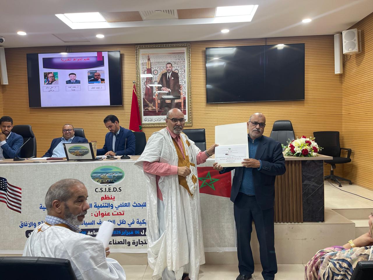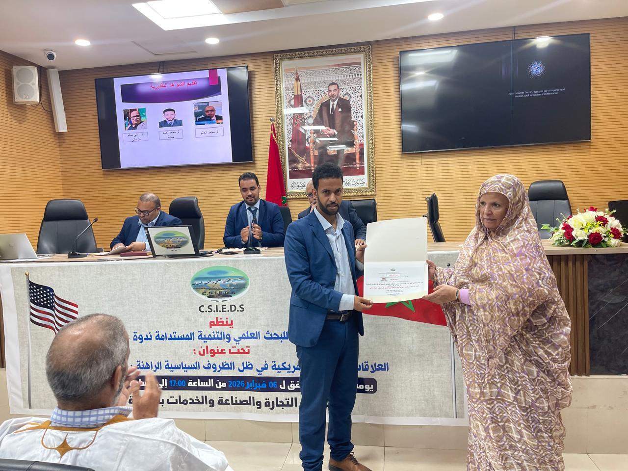 احتضنت غرفة التجارة والصناعة والخدمات بمدينة الداخلة، مساء يوم الجمعة 06 فبراير 2026، الموافق لـ17 شعبان 1447 هـ، ندوة علمية نظمها مركز الساحل للبحث العلمي والتنمية المستدامة تحت عنوان: “العلاقات المغربية الأمريكية في ظل الظروف السياسية الراهنة: الواقع والآفاق”، بحضور وازن لفعاليات أكاديمية ومدنية ومنتخبين وأعيان وشيوخ ومهتمين بالشأن العام.