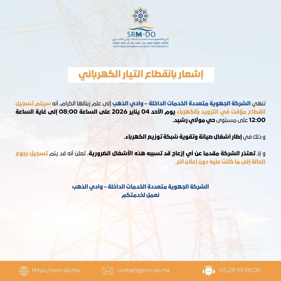 أعلنت الشركة الجهوية متعددة الخدمات الداخلة – وادي الذهب عن برمجة انقطاع مؤقت في التزويد بالتيار الكهربائي، وذلك يوم الأحد 04 يناير 2026، ابتداءً من الساعة الثامنة صباحًا إلى غاية الساعة الثانية عشرة زوالًا، على مستوى حي مولاي رشيد.