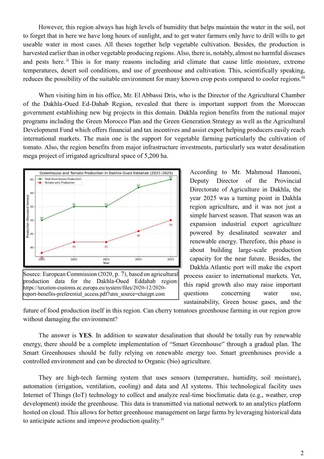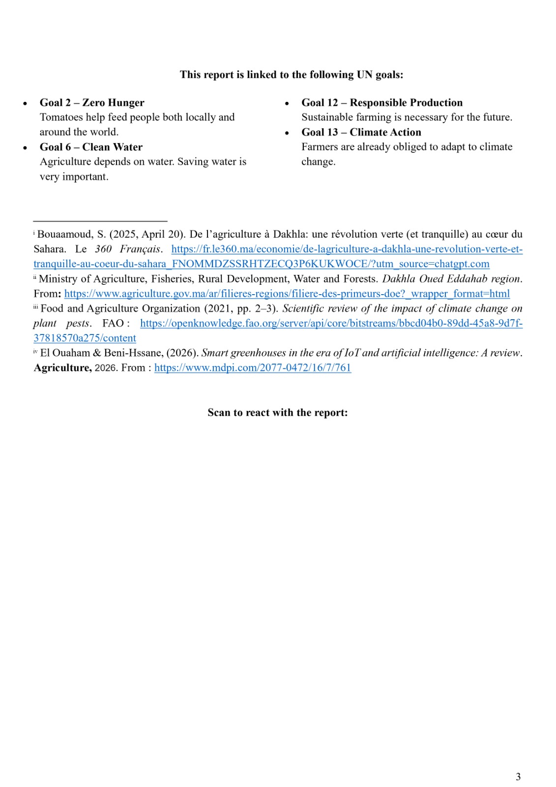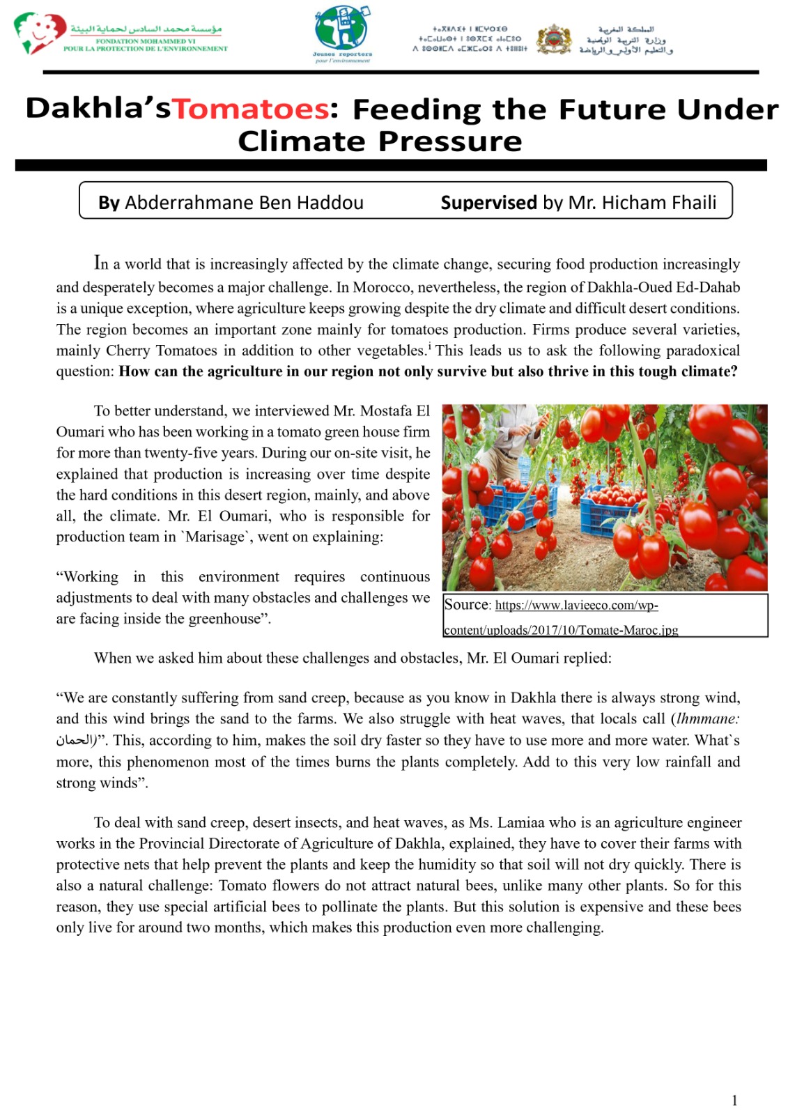 وقد أنجز التلميذ تقريره باللغة الإنجليزية تحت عنوان “Dakhla’s Tomatoes: Feeding the Future under the Climate”، حيث تناول من خلاله أهمية زراعة الطماطم بمدينة الداخلة ودورها في دعم الأمن الغذائي، خاصة في ظل التغيرات المناخية المتسارعة التي يعرفها العالم.